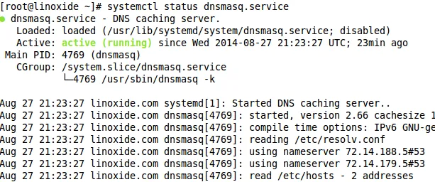 [root@linoxide ~]# systemctl status dnsmasq