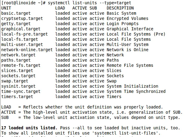 [root@linoxide ~]# systemctl list-units --type=target