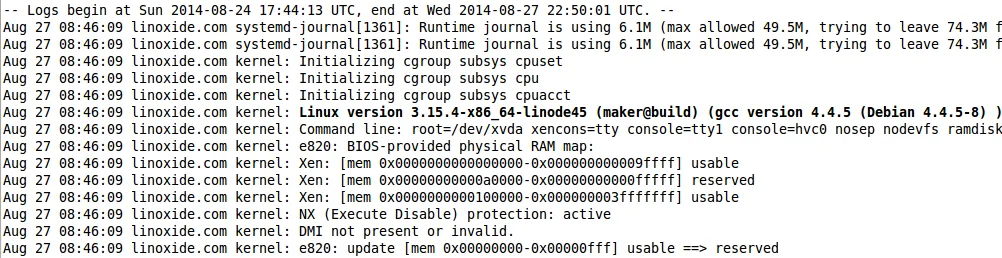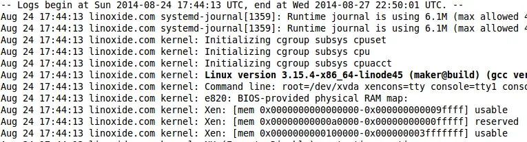 [root@linoxide ~]# journalctl -b