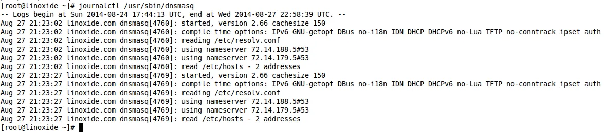 [root@linoxide ~]# journalctl /usr/sbin/dnsmasq