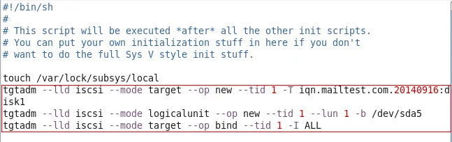 这在儿,有个要点需记住,那就是开机后,上面3条命令创建的iSCSI会失效,要想开机后还有,那就把上面的3条命令添加到/etc/rc.d/rc.local里面,看图: