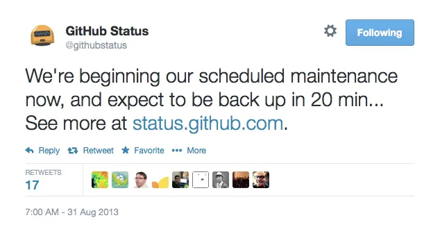 我们将 GitHub 网站设置为维护模式,并在 Twitter 上发表声明,然后开始按上述任务清单的步骤开始工作: