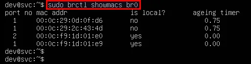 $ sudo brctl showmacs <bridge-name>