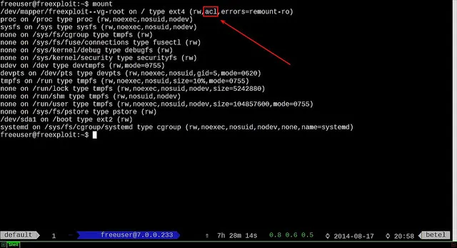 你可以注意到,我的root分区中ACL属性已经开启。万一你没有开启,你需要编辑/etc/fstab文件,在你需要开启ACL的分区的选项前增加acl标记。