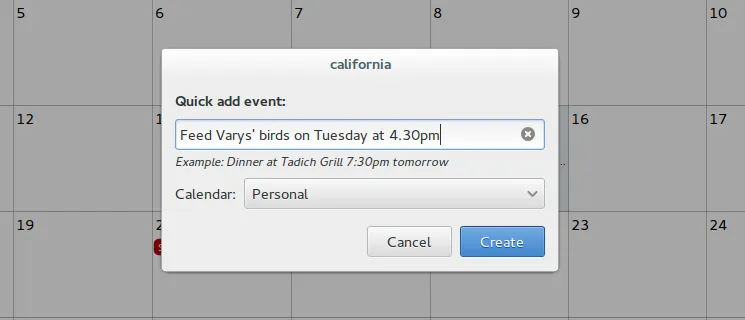 最突出变化的是添加了“自然语言”解析器。这使得添加事件更容易。你可以直接输入“在下午2点就Nachos会见Sam”接着California就会自动把它安排下接下来的星期一的下午两点,而不必你手动输入位的信息(日期,时间等等)。(LCTT 译注:显然你只能输入英文才行)