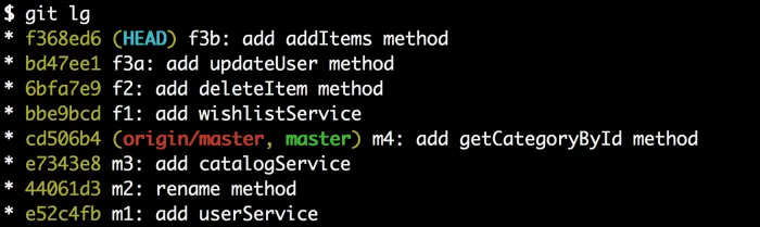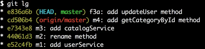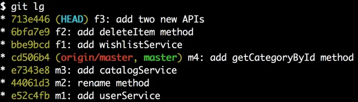 让我们创建两个新的提交:首先让我们为可以提交到主分支的userService.js创建一个提交。运行git add userService.js 接着运行 git commit -m “f3a: add updateUser method”。