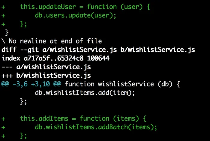 太棒了!让我们为wishlistService.js的改变创建另外一个提交。运行git add wishlistService.js,接着运行git commit -m “f3b: add addItems method”.