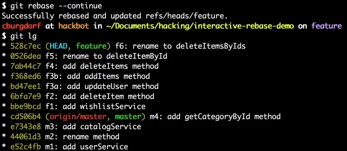 这就是我们想要的,除了f4、f5、f6仍旧缺失。这是因为我们仍在rebase交互的中间,我们需要告诉git继续rebase。用下面的命令继续:git rebase –continue。