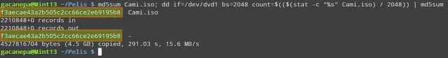 命令的第一部分计算.iso文件的md5校验和,而第二部分则读取/dev/dvd1中的磁盘内容,然后通过管道输出给md5sum工具。“bs=2048”表示dd命令将使用2048字节块为单位检查,因为原始iso文件以2048为单位划分。