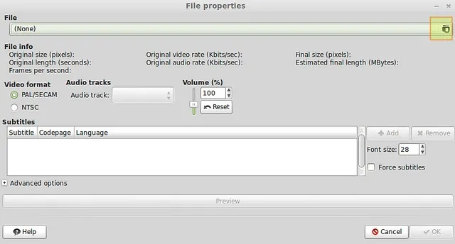 “文件属性”对话框用于添加文件到当前标题。点击文件夹图标(右上角),然后浏览你的计算机以选择想要的文件。你也可以通过点击副标题对话框右边的添加按钮添加一个副标题文件。选择好视频文件(又或者是副标题文件)后,点击右下角的确定。