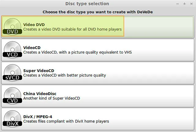 启动DeVeDe并从菜单选择视频DVD。