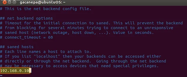 3) 让我们编辑/etc/sane.d/net.conf文件,并在扫描仪安装后添加服务器IP地址: