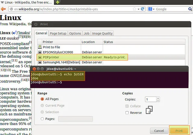 在Ubuntu12.04执行打印,本地登录用户为jdoe(同样的帐号名称但是服务器上是不存在的)。