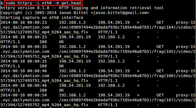 $ sudo httpry -i eth0 -m get,head