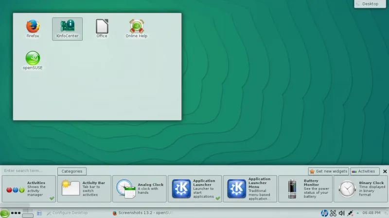KDE 桌面使用了最新稳定版本的长期支持版 Plasma Workspace (4.11.12)。长期支持版意思是没有新功能,只有稳定性改进和故障修复。软件集合的应用程序部分也更新到了其最新稳定版 (4.14.2)。