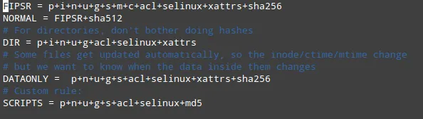 例如,上面的例子说明,NORMAL规则将检查下列属性的不一致性:权限(p)、索引节点(i)、链接数(n)、用户(u)、组(g)、大小(s)、修改时间(m)、创建时间(c)、ACL(acl)、SELinux(selinux)、xattrs(xattr)、SHA256/SHA512校验和(sha256和sha512)。