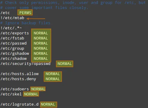 默认配置文件是/etc/aide.conf,该文件介绍了几个示例保护规则(如FIPSR,NORMAL,DIR,DATAONLY),各个规则后面跟着一个等号以及要检查的文件属性列表,或者某些预定义的规则(由+分隔)。你也可以使用此种格式自定义规则。