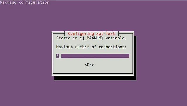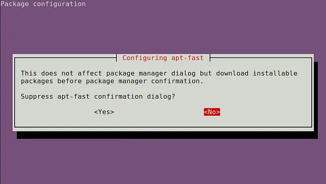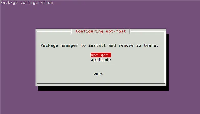 在安装期间,你需要选择一个默认的软件包管理器 (e.g., apt-get. aptitude ),还需要设置其余选项。但是你可以随时通过编辑配置文件 /etc/apt-fast/conf 来更改设置。