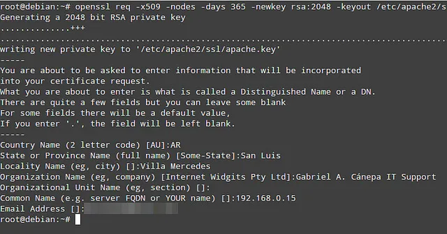 # openssl req -x509 -nodes -days 365 -newkey rsa:2048 -keyout /etc/apache2/ssl/apache.key -out /etc/apache2/ssl/apache.crt