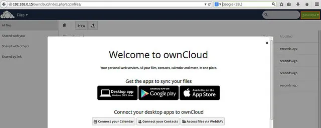 打开你的浏览器并定位到你的ownCloud实例中,地址是 http://服务器 IP/owncloud: