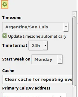 提示:你还需要设置你的时区以便在其他程序中成功地导入你的日历(默认情况下,日历程序将使用UTC+00:00时区)。要更改时区在左下角点击小齿轮图标,接着日历设置菜单就会出现,你就可以选择时区了: