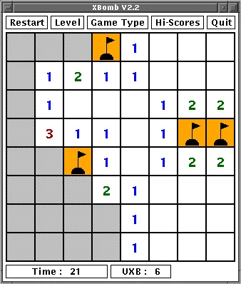 XBomb是针对X Windows系统扫雷游戏,它有三种不同的表尺寸和卡牌风格,包含有不同的外形:六角形、矩形(传统)或三角形。不幸的是,在Ubuntu 14.04中的版本会出现程序分段冲突,所以你可能需要安装另外一个版本。 首页。