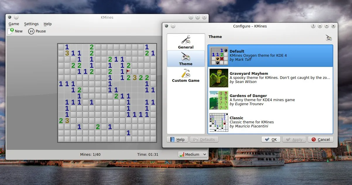 KMines是一个KDE游戏,和GNOME Mines类似,有三个内建表尺寸(简易、中等、困单),也可以自定义,支持主题和高分。