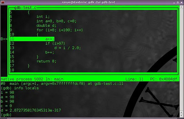 不出意外,程序会停留在11行。这里,我们可以做些有趣的事情。下列命令: