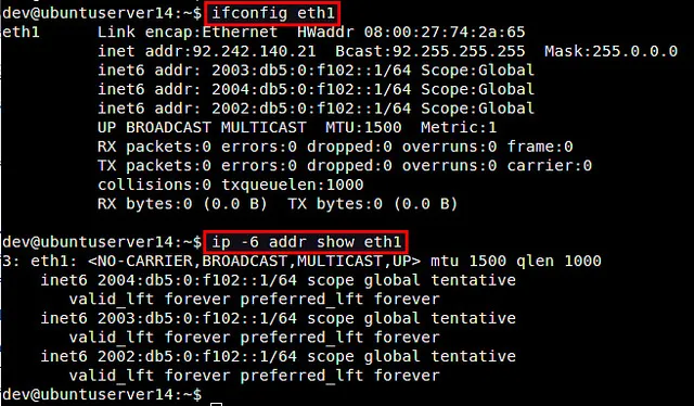 $ sudo ifconfig eth1 inet6 add 2003:0db5:0:f102::1/64