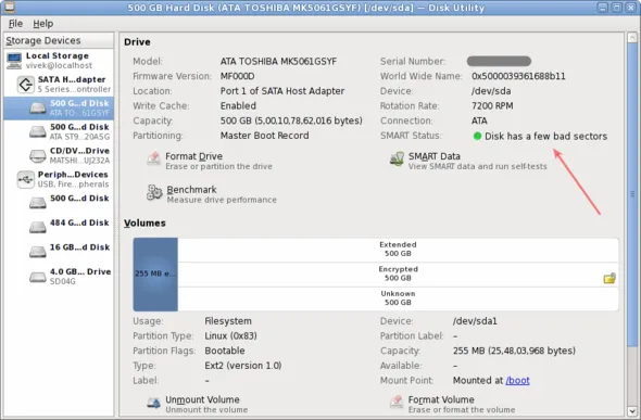 你也可以像下面显示的那样使用smartctl命令: