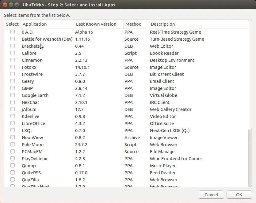 UbuTricks是一个有简单界面,基于Zenity的图形脚本。虽然早期开发中,它的目标是通过简单的界面操作来安装Ubuntu14.04 及以后发行版上应用程序的更新。