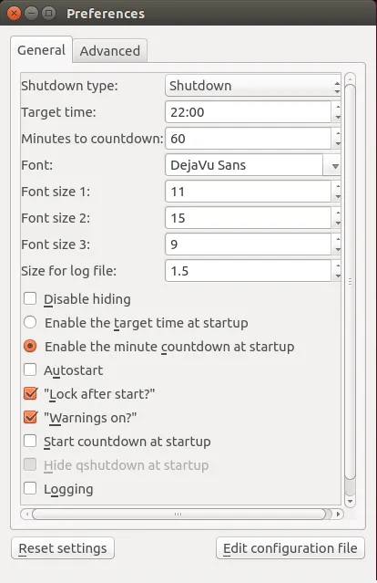 倒计时最大计数为1440分钟(24小时)。配置文件(和日志文件)位于~/.qshutdown,配置文件为:qshutdown.conf。