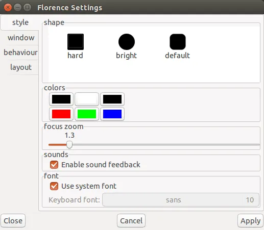 在 Florence 的 “样式 (style)” 菜单中,你能够自定义键盘样式,启用/取消声音效果。