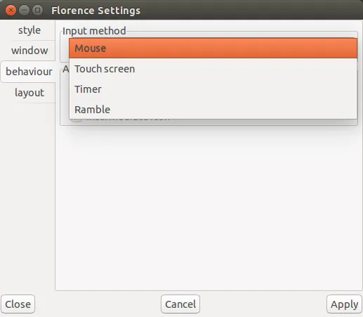 在“行为 (behaviour)”菜单中,你能够改变输入方法。Florence 支持几种不同的输入法: 鼠标 (mouse)、触摸屏 (touch screen)、计时器 (timer) 和漫步 (ramble)。鼠标输入是默认输入法。最后的两种输入法不需要按鼠标键。 计时器输入通过将指针滞留在按键上一定时间来触发按键。漫步输入的原理跟计时器输入差不多,但是经过训练和灵巧使用,能够比计时器输入更加迅速。