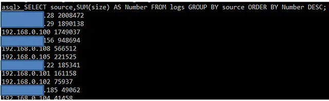 SELECT source, SUM(size), AS NUMBER FROM logs GROUP BY source ORDER BY Number DESC;