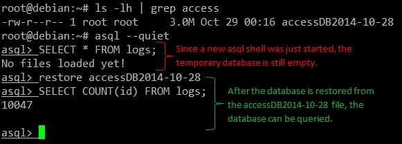 当 asql 完成对 access 日志的加载后,我们就可以开始数据库查询了。注意一下,加载后生成的数据库是 “temporary” (临时)的,意思就是数据库会在你退出 asql 的时候被清除。如果你想要保留数据库,你必须先将其保存为一个文件。我们会在后面介绍如何这么做(参考 example 3 和 4)。