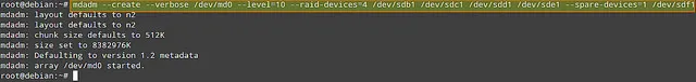 # mdadm --create --verbose /dev/md0 --level=10 --raid-devices=4 /dev/sd[bcde]1 --spare-devices=1 /dev/sdf1
