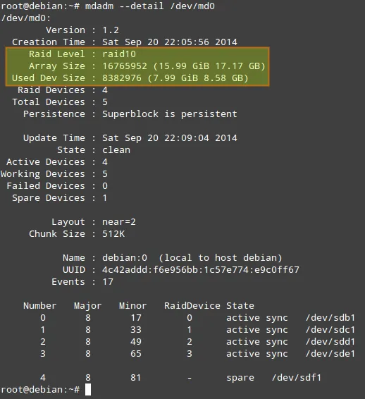 - Array Size表示阵列的整体大小。RAID 10阵列的大小通过(N*C)/M计算,其中N是活跃磁盘的数目,C是每个活跃磁盘的容量,M是每一个镜像中磁盘的数目。在本文的情形下,这个值等于(4*8GiB)/2 = 16GiB。