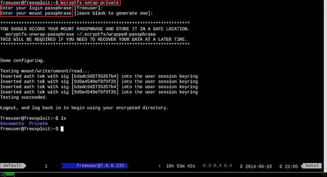 你会注意到,eCryptFS默认在你的家目录中创建了两个目录:Private和.Private。~/.Private目录包含有加密的数据,而你可以在~/Private目录中访问到相应的解密后的数据。在你登录时,~/.Private目录会自动解密并映射到~/Private目录,因此你可以访问它。当你登出时,~/Private目录会自动卸载,而~/Private目录中的内容会加密回到~/.Private目录。