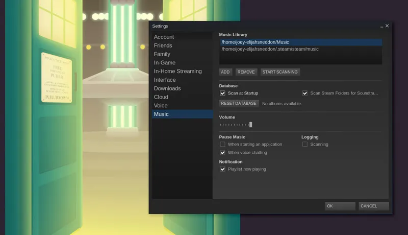 显然,添加音乐是你播放音乐前的第一件事。在Ubuntu上,默认设置下,Steam会自动添加两个文件夹:Home下的标准Music目录和它自带的Steam Music文件夹。任何可下载的音轨都保存在其中。