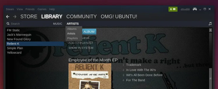 Steam Music会默认的将音乐按照专辑进行分组。若想按照乐队名进行浏览,你需要点击‘Albums’然后从下拉菜单中选择‘Artists’。