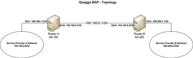 - 运营商 A: ASN (100), IP地址空间 (100.100.0.0/22), 分配给BGP路由器eth1网卡的IP地址(100.100.1.1)