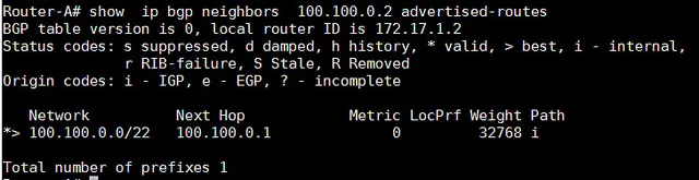 Router-A# show ip bgp neighbors 100.100.0.2 advertised-routes