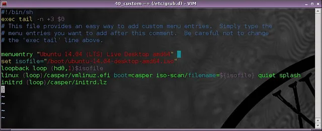 例如,如果你想要从ISO文件启动Ubuntu,那么你就是想要添加如下行到40_custom文件:
