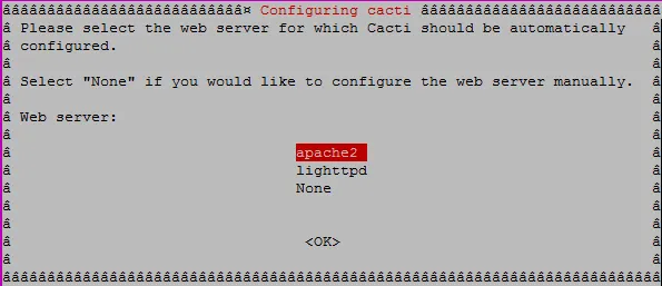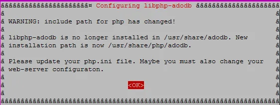 上面的命令开始 Cacti 的安装,你会看到下图中 PHP 路径的更改,选择 ok 按回车