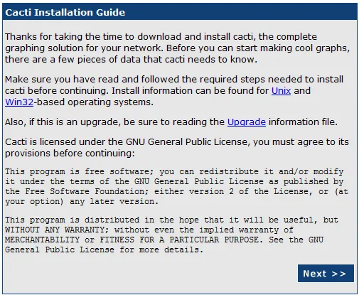 在浏览器中访问 http://你的服务器IP/cacti/install/ 来进行初始化设置,点击 next 下一步