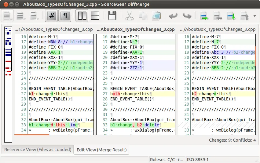 • 图形化显示三个文件之间的差别。(安全的前提下)允许自动合并,并对最终文件可以随意编辑