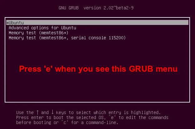 首先,打开你的电脑。当你看到初始的GRUB菜单时,按下‘e’。