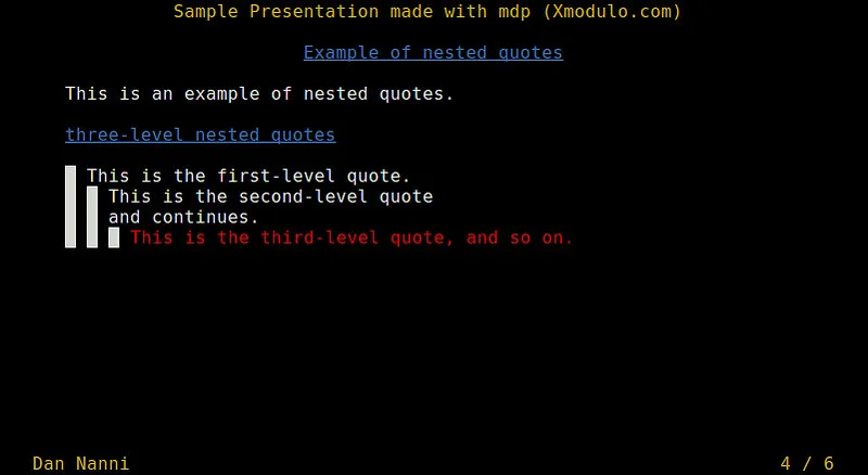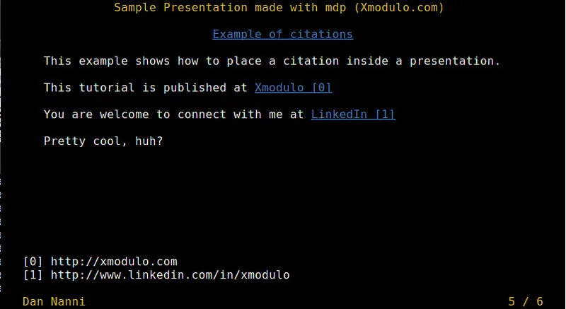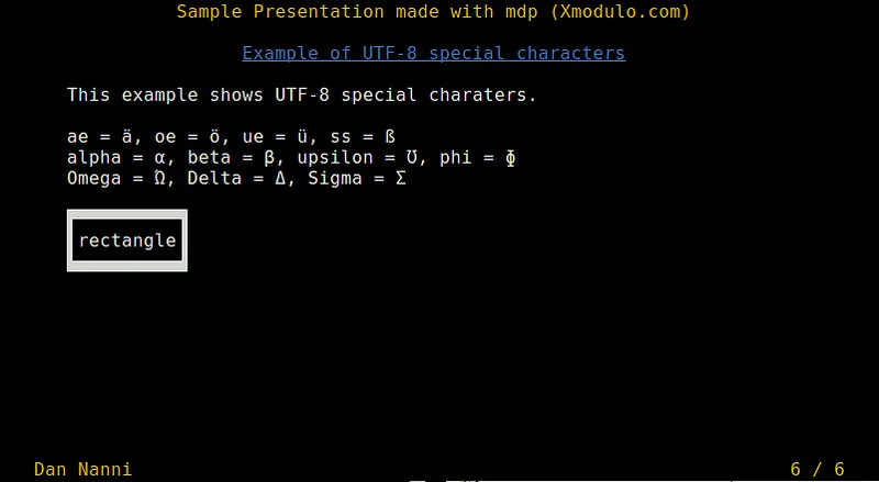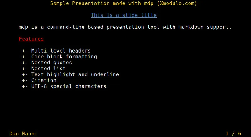 mdp是Linux下一款基于ncurses的命令行演示工具。我喜欢mdp在于它对markdown的支持,使得我很容易以熟悉的markdown格式来创建幻灯片。自然,它还可以很轻松地用HTML格式来发布幻灯片。另一个好处是它支持UTF-8字符编码,这让非英语字符(如希腊或西里尔字母)的展示也变得很方便。
