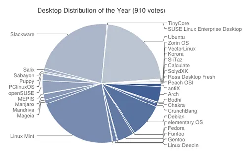 你也可以在这里找到一份较为精美的调查问卷总结图.这里呈现了网站投票得出的最佳Linux发行版, 可以看到Mint和Slackware平分了半壁江山: